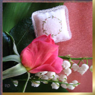 Rêve de Printemps avant l'Hiver Suite à la construction du site , il fallait faire du rangement dans les photos. Et............ Petit Coussin Boutons de rose Broderie en Soie : Point de tige et Point lancé Dentelle à la Fourche miniature Je suis désolée de ne pas pouvoir vous montrer davantage de détail . Je n'ai plus le petit coussin ...